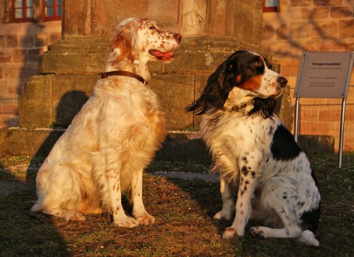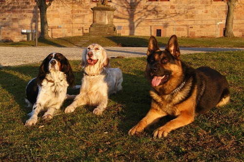 Mal wieder typisch: Während sich die beiden Vogelhunddamen von den Amseln auf der Burgmauer magisch angezogen fühlen, interessiert sich der Schäfi für solcherlei Pipifax überhaupt gar nicht :-)